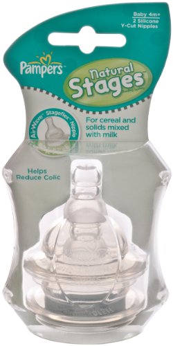 Pampers Silicone AirWave Aspirational Nipples, Y-Cut (twin pack)Natural Stage Y-cut fast flow and cereal feeding Stageflex silicone nipples encourage your baby to use their tongue and jaw to create a natural feeding rhythm that developments baby's teeth, facial and jaw muscles through shape, flow and suction in much the same way that breastfeeding does. Exclusive Airwave venting system is clinically proven to help reduce colic and it's one-piece design makes it easy to clean.